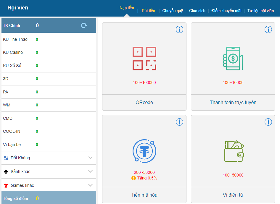 Các phương thức thanh toán phổ biến như thẻ tín dụng, chuyển khoản ngân hàng, ví điện tử, các cổng thanh toán điện tử nội địa đều được tích hợp đầy đủ, đảm bảo hoạt động và an toàn trong mỗi giao dịch. Nhờ đó, người chơi có thể yên tâm tận dụng các dịch vụ đánh bạc mà không lo về vấn đề tài chính.